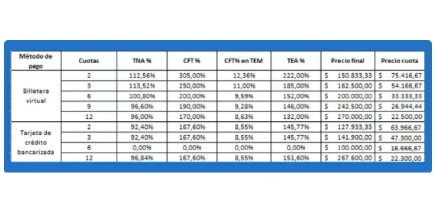 Pero al analizar el Costo Financiero Total (CFT), se observa una diferencia significativa. Por ejemplo, en una compra de $100.000 financiada en 2 cuotas, el CFT de las billeteras virtuales alcanza el 305%, mientras que en tarjetas de crédito es del 167,60%. Es decir, los costos que no se pagan en mantenimiento de cuenta terminan reflejándose en tasas de interés más altas.