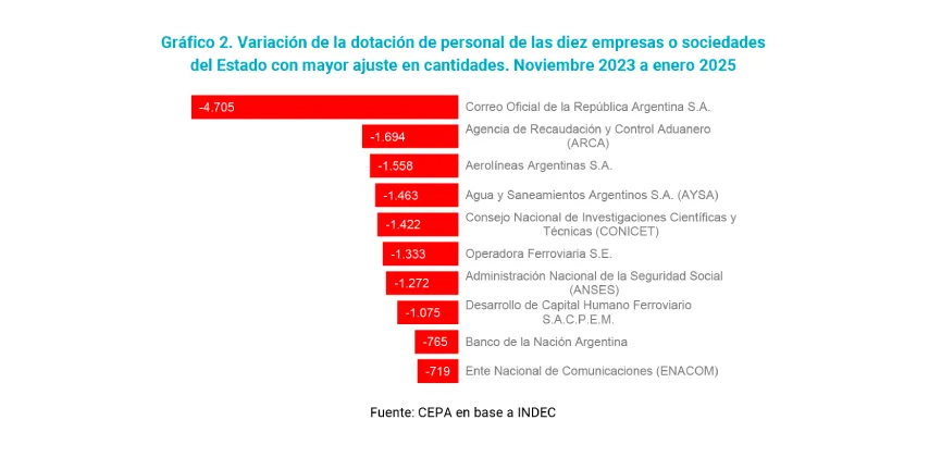 Un informe del Centro de Economía Política Argentina (CEPA) detalla que el Correo Argentino encabeza la lista con 4.705 empleados menos, seguido por ARCA (ex AFIP) con 1.694 despidos. Entre las empresas estatales más afectadas también se encuentran: