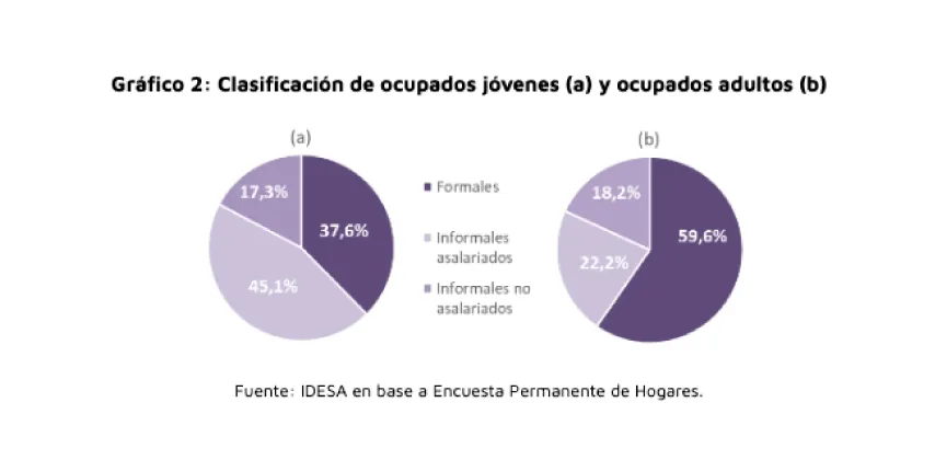 Esta diferencia se explica en parte por la alta informalidad laboral juvenil: según la Encuesta Permanente de Hogares (EPH), el 62,4% de los jóvenes ocupados trabaja en condiciones informales, mientras que entre los adultos la informalidad se reduce al 40,4%.