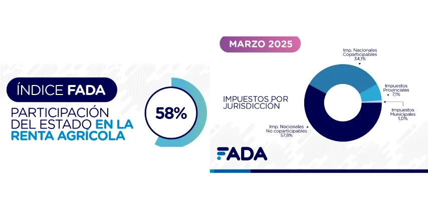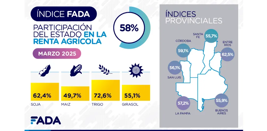 La Fundación Agropecuaria para el Desarrollo de Argentina (FADA) reveló que el Estado se queda con $58 de cada $100 de renta agrícola. Aunque bajó 6,3 puntos respecto a la medición anterior (que marcaba 64,3%), la carga impositiva sigue siendo alta.