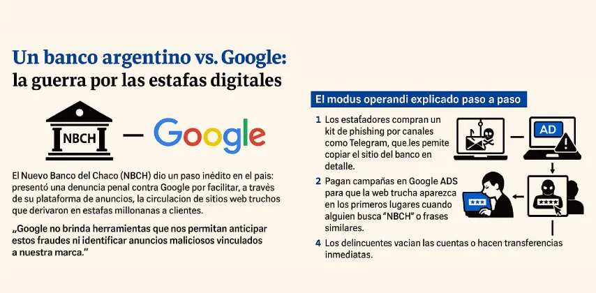 El Nuevo Banco del Chaco (NBCH) dio un paso inédito en el país: presentó una denuncia penal contra Google por facilitar, a través de su plataforma de anuncios, la circulación de sitios web truchos que derivaron en estafas millonarias a clientes. La medida, sin precedentes en el sistema financiero local, pone sobre la mesa un problema creciente: el uso de plataformas digitales para engañar a usuarios desprevenidos.