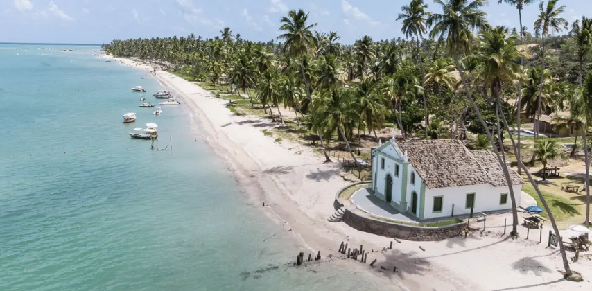 4. Praia dos Carneiros, Tamandaré, Pernambuco: Famosa por su capilla frente al mar, esta playa combina la belleza natural de sus palmeras y aguas turquesas con una atmósfera relajada y encantadora, perfecta para disfrutar de un día en contacto con lo mejor de la costa brasileña.