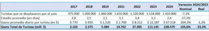 El gasto total de $228.479 millones representa una caída real del 33,3% en comparación con 2023, ya que el contexto económico y la ausencia de Previaje hicieron que los turistas optaran por actividades gratuitas y redujeran sus gastos en gastronomía. Aún así, ciudades como Mar del Plata, Bariloche y Puerto Iguazú mantuvieron altos niveles de ocupación hotelera.