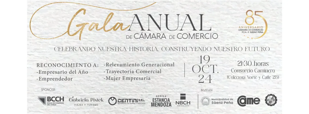 La ciudad de Sáenz Peña se prepara para un evento de gran relevancia: la gala por los 85 años de la Cámara de Comercio, que rendirá homenaje a quienes han hecho historia y marcan el camino en el ámbito comercial. Con un reconocimiento especial a empresarios en categorías como emprendedor del año y trayectoria dirigencial, la Cámara reafirma su compromiso con el crecimiento y la sostenibilidad del comercio local.