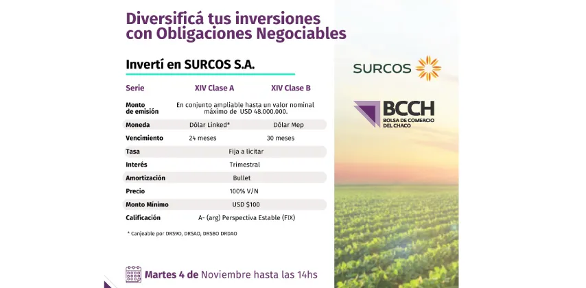 La Bolsa de Comercio del Chaco propone diversificar tus inversiones a través de Obligaciones Negociables de SURCOS S.A.