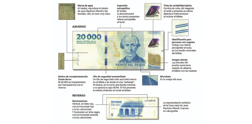 1. Tocar el billete: Los ejemplares auténticos tienen relieves perceptibles en zonas clave como el retrato de Juan Bautista Alberdi y el número "20000".