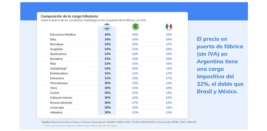 Un reciente informe elaborado por las principales cámaras de la industria metalúrgica puso en evidencia un hecho alarmante: el 44% del precio final de los productos metalúrgicos corresponde a impuestos, incluyendo el IVA. Sin el IVA, la carga tributaria promedio se ubica en un 32% sobre el precio en puerta de fábrica, cifra que duplica a la de países vecinos como Brasil y México.